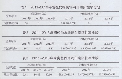 截止2014年8月8日對全國種雞群的最新調查顯示,檢測17個祖代種雞場血清樣品2550份,總體陽性率為0.43%;檢測27種地方品系雞血清樣品1526份,總體陽性率16.9%。
