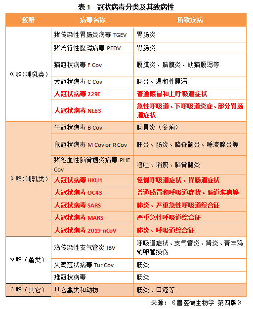 分類學(xué)上冠狀病毒屬套式病毒目-冠狀病毒科的單股正鏈RNA病毒,其復(fù)制依賴的RNA聚合酶缺乏校正功能,研究發(fā)現(xiàn)冠狀病毒有不連續(xù)轉(zhuǎn)錄和聚合酶跳躍的復(fù)制方式,這些特性導(dǎo)致病毒易發(fā)生高頻的基因重組和變異(Lai MMC et al., 1992),從而演化成不同簇群。這類病毒大家族擁有許多家庭成員,是自然界中存在的可引起家畜、家禽、寵物和人類疾病的重要病原體。根據(jù)其基因差異,分為α、β、γ和δ4個簇群,可分別感染不同的宿主引起各種臨床癥狀,α、β簇群主要感染哺乳動物,而γ、δ簇群主要感染禽類(表1)。