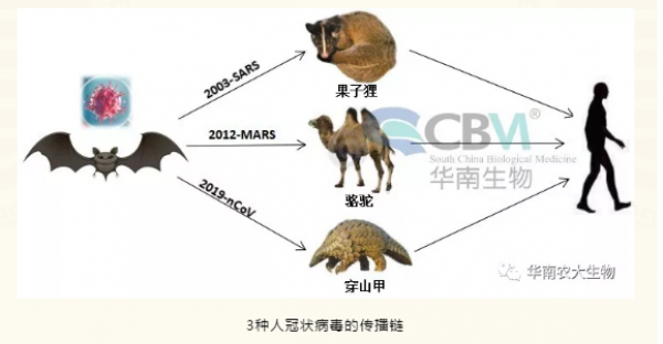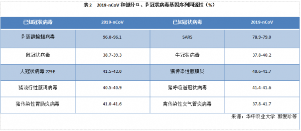 人源冠狀病毒:目前發(fā)現(xiàn)能夠感染人類并誘發(fā)疾病的冠狀病毒共有7種,其中3種為高致病性毒株。①是最為人們熟悉的非典肺炎病毒2003-SARS,中國科學(xué)院武漢病毒研究所的科研團(tuán)隊經(jīng)多年溯源性研究發(fā)現(xiàn)病毒源自云南地區(qū)的中華菊頭蝙蝠,揭示了“蝙蝠→果子貍→人類→人際”的傳播鏈條;②是暴發(fā)于沙特阿拉伯,席卷整個中東和歐洲地區(qū)的中東呼吸綜合征病毒2012-MERS,則是通過駱駝再傳播到人類的。③是本次發(fā)生疫情的病毒2019-nCoV,近期取得了許多進(jìn)展。華中農(nóng)業(yè)大學(xué)研究人員分析比對了GISAID數(shù)據(jù)庫2019-nCoV全基因組序列發(fā)現(xiàn)與已知的云南蝙蝠β冠狀病毒(BetaCoV/bat/Yunnan/RaTG13/2013| EPI_ISL_402131)高度相似,達(dá)96.0%-96.1%;與2003-SARS相似性為78.9-79.0%;而與其他人和動物冠狀病毒間的基因組相似性只有40%左右(表2)。中國動物衛(wèi)生與流行病學(xué)中心對2019-nCoV與禽源冠狀病毒的親緣關(guān)系進(jìn)行分析發(fā)現(xiàn)二者核苷酸同源性較低,初步排除來源于已知家禽冠狀病毒的可能性。而就在2月7日華南農(nóng)業(yè)大學(xué)等單位通過對野生動物樣品的宏基因組學(xué)分析并鑒定分離自穿山甲的冠狀病毒毒株基因序列與2019-nCoV同源性高達(dá)99%,說明穿山甲為潛在的中間宿主。